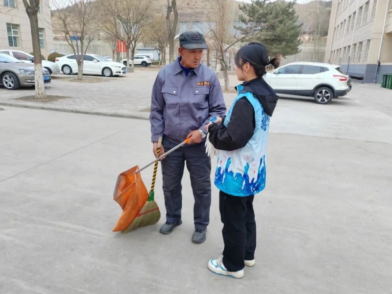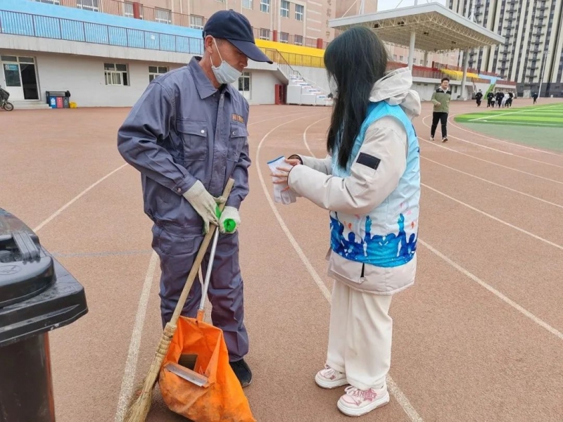 志愿者一行来到校园环卫工人处,细心了解工人们的身体状况和生活情况,为环卫工人送上一杯热茶。随后大家分工合作,主动拾起校园中的垃圾,尽微薄之力减轻环卫工人的负担。志愿者们还为环卫工人送上一双手套,让他们更好的保护自己的双手。活动现场欢声笑语、其乐融融。