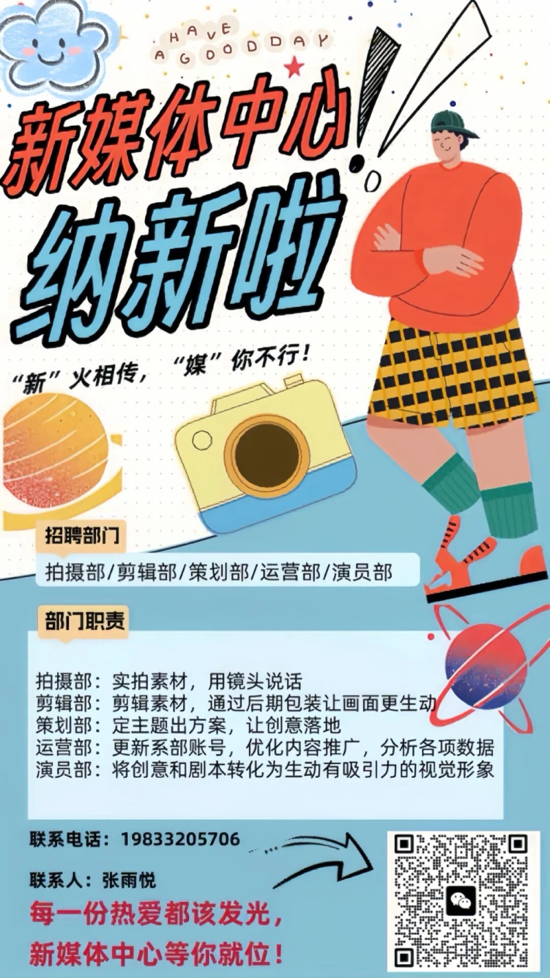 为进一步壮大新媒体中心队伍,提升校园宣传影响力,更好地传递校园声音、讲好校园故事,现面向张职院电子商务系全体新生开启纳新工作,诚邀热爱新媒体、有想法、敢创新的你加入!