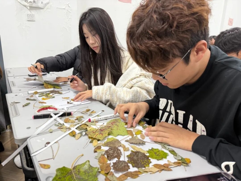 为让同学们深入感受秋日“叶韵秋华” 的自然意境,提升对自然美学与手工艺术的认知,同时打破传统创作边界、激发无限创意。以秋日装饰与艺术展板布置现场,营造浓厚艺术氛围。我系举办“叶韵秋华,创意无限” 树叶贴画创意活动。