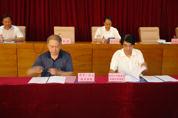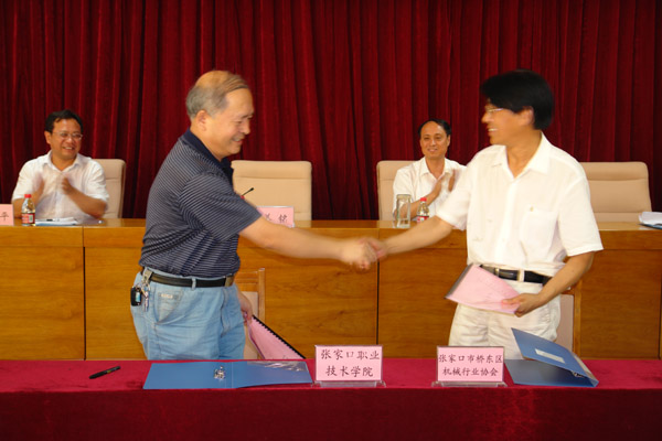 7月15日上午,学院与张家口市桥东区机械行业协会在图书办公综合楼三楼报告厅就人才培养与技术合作基地举行签约仪式。桥东区委书记张常喜、副区长苏建君、桥东区东山生态型工业区管委会领导、张家口市桥东区机械行业主要企业代表与学院相关部门的有关人员出席大会。仪式议程由学院副院长陈怀勇主持,学院党委书记姜铭和桥东区委书记张常喜先后致辞,姜铭书记代表学院,王中生秘书长代表桥东区机械行业协会分别在签约文本上签字。签字仪式后,与会来宾在机械实训中心外举行了揭牌仪式,宋德明副院长和苏建君副区长共同拉下绸布。仪式结束之后,与会人员合影留念并在学院领导的陪同下参观了机械实训中心和汽车实训中心。