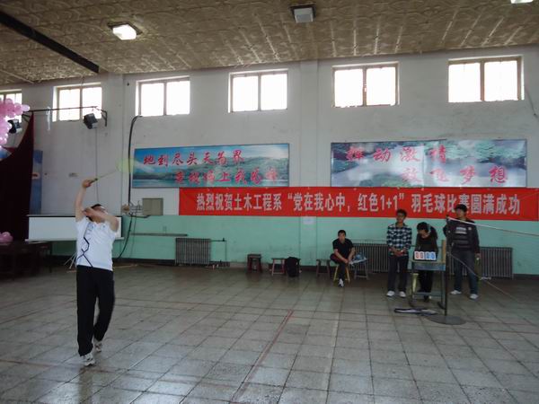 为纪念中国共产党建党90周年,土木工程系党支部积极开展系列庆祝活动。5月9日下午,学院党委副书记张树敏同志为土木工程系“党在我心中,红色1+1”教工羽毛球比赛开球,就此拉开了土木工程系庆祝建党90周年系列活动的序幕。全系24名教工分男女两组全部参赛,经过一个多月的紧张比赛,于6月8日落下帷幕,比赛奖品及服装由土木系用人单位提供赞助。