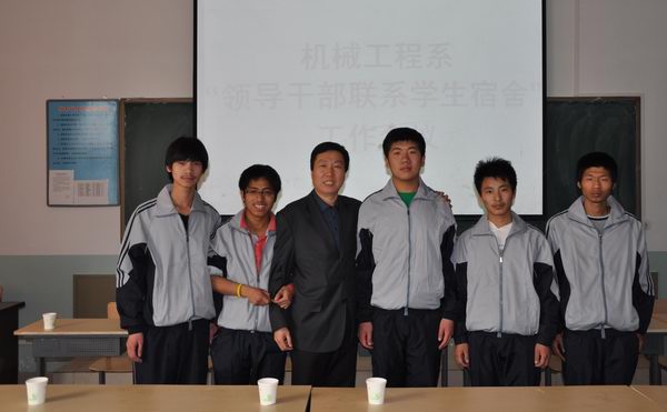 温九祥书记首先代表全系师生向联系学生宿舍的各位领导表示热烈的欢迎和诚挚的感谢。随后向与会的各位领导介绍了机械工程系的简要情况,介绍各位领导与各宿舍同学见了面,对联系学生宿舍工作做了具体安排,并对各宿舍同学提出了希望和要求。所联系的各宿舍向领导们提供了宿舍同学的信息资料。