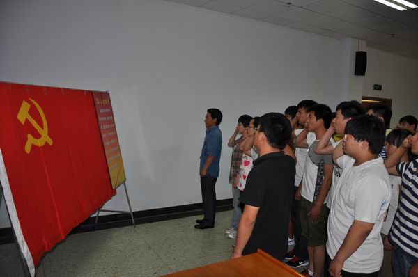 新党员宣誓大会上,刚刚加入党组织的新党员面向党旗,在经济管理系党支部副书记闫树斌的带领下庄严宣誓。