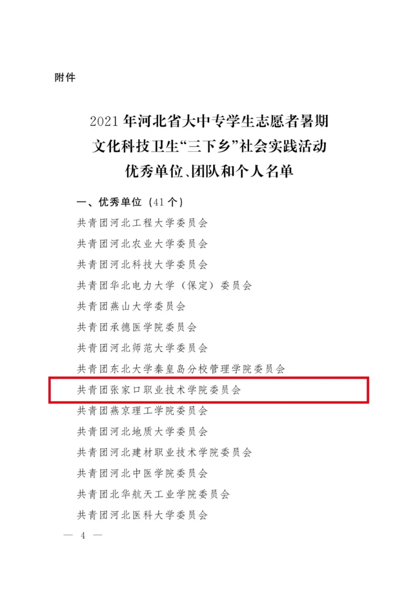 近日,河北省委宣传部、省委文明办、省教育厅、团省委、省学联对在2021年河北省大中专学生志愿者暑期文化科技卫生“三下乡”社会实践活动中表现突出的41个优秀单位、51个优秀团队、43名优秀个人进行通报表扬。best365团委荣获2021年河北省大中专学生志愿者暑期文化科技卫生“三下乡”社会实践活动优秀单位。