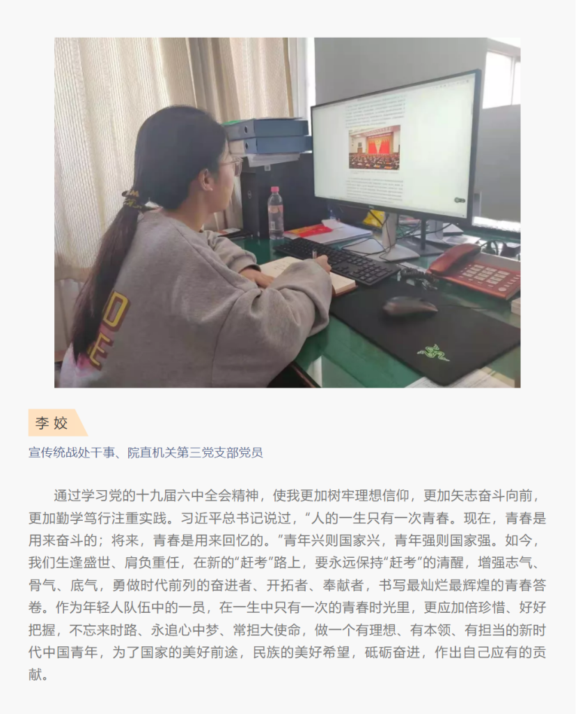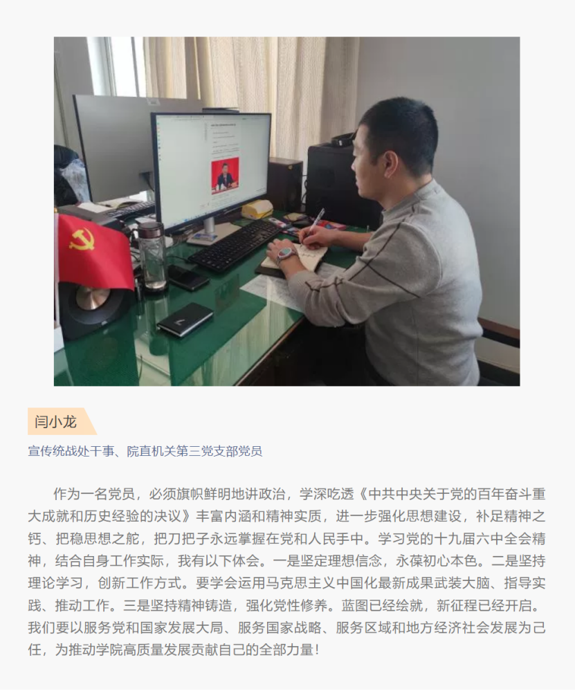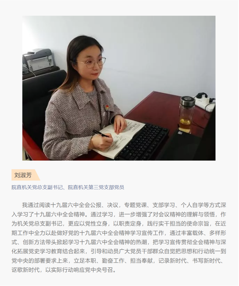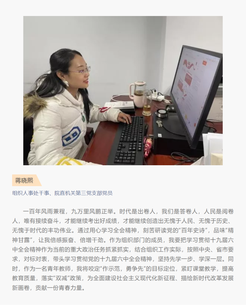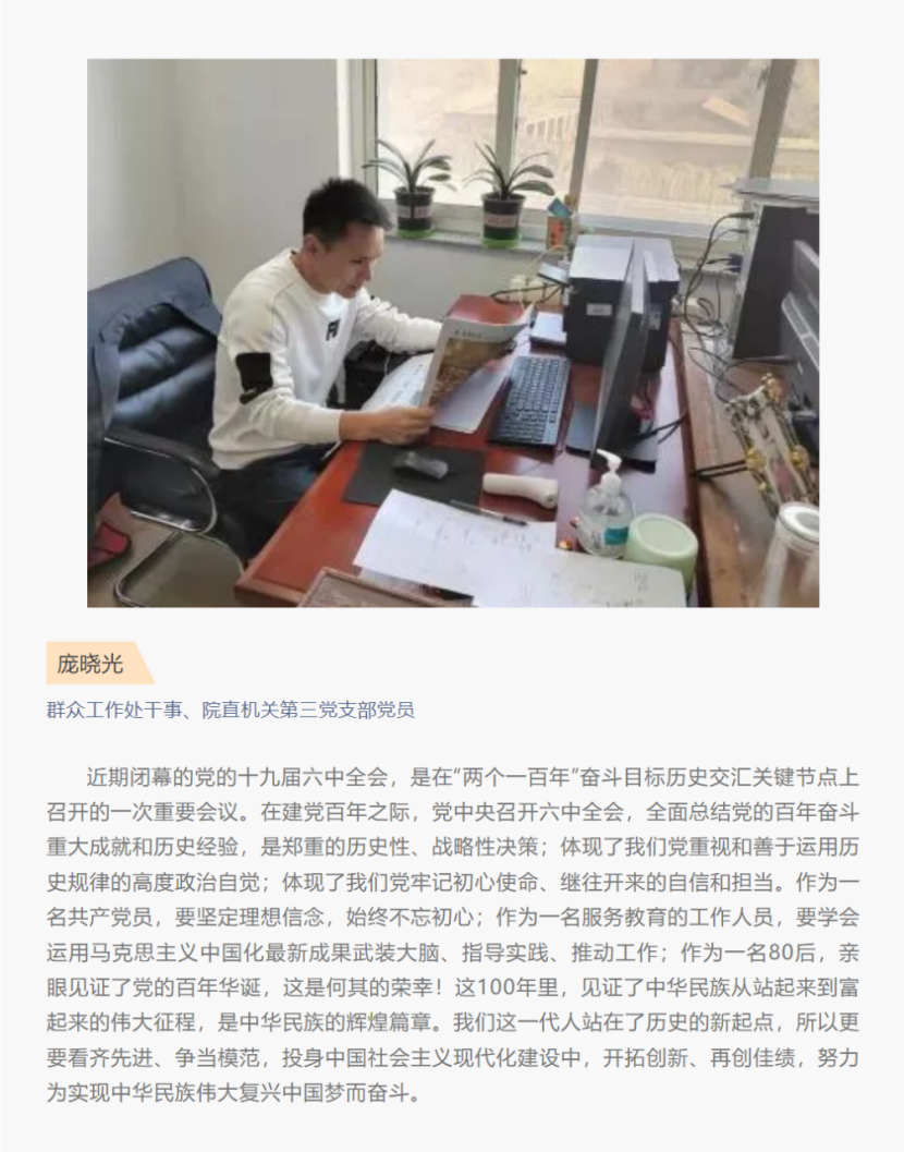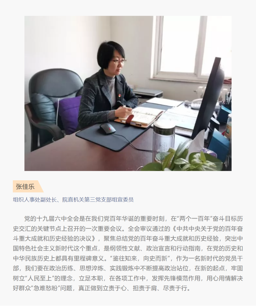 为进一步加强党组织建设,提升党建工作水平,发挥行政支部的战斗堡垒作用。近期,院直机关第三党支部以线上线下多种方式先后组织支部党员学习领会党的十九届六中全会精神,并撰写心得体会。以学促行,以行见效,把全会精神运用在工作中,为学院新时代高水平高职院校建设,作出更大贡献,以更加优异的成绩迎接党的二十大召开。