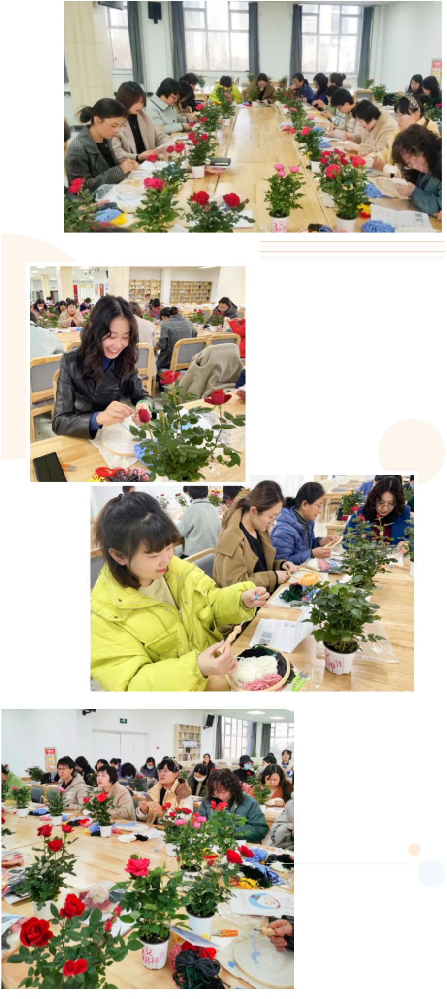 活动特邀城垣文化发展有限公司讲师吴立曼为大家进行讲解。吴立曼分别介绍了苏绣、湘绣、粤绣、蜀绣四大名绣的特点,并现场讲解演示刺绣技巧与步骤。细细手中线,浓浓爱校情。伴着室内弥漫的花香和现场的欢声笑语,学员们认真构思创意,精心绣制作品,交流刺绣技术,在一刺一墩之间呈现出一件件细致精美的刺绣作品。大家用一件件质朴的刺绣作品传承匠心精神,表达对学院的热爱之情,对冬残奥会圆满顺利举办的祝福之情。