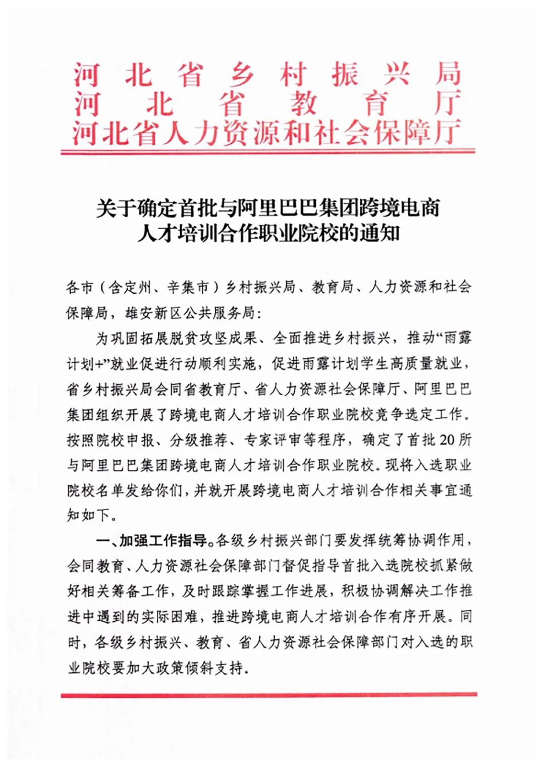 近日,河北省乡村振兴局、河北省教育厅、河北省人力资源和社会保障厅公布了《关于确定首批与阿里巴巴集团跨境电商人才培训合作院校的通知》,经过专家评审和教育厅审核,best365在众多参评院校中脱颖而出,成功获批首批与阿里巴巴集团跨境电商人才培训合作职业院校。