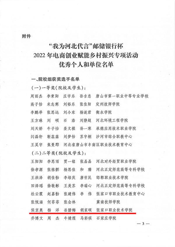 日前,由河北省人力资源和社会保障厅、河北省教育厅、河北省乡村振兴局、省财政厅、邮储银行河北分行联合举办的“我为河北代言”邮储银行杯2022年电商创业赋能乡村振兴专项活动获奖名单正式公布,由我校机电工程学院学生侯京奥、信息工程与艺术设计学院学生杨洋、胡家硕、汽车工程系学生岳腊梅组成的电商团队荣获二等奖,学院教师金铭钰、张楠获“优秀指导老师”称号。