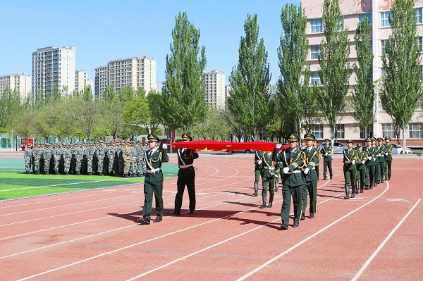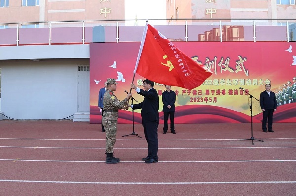 党委书记冯印涛为军训团授旗并宣布2023年军训活动正式启动。