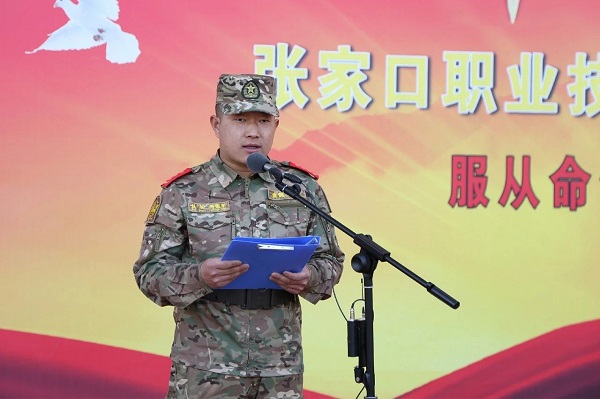 教官代表乔雪平代表全体军训教官,就严格遵守训练大纲要求和组织纪律,以身作则带领学生们完成好军事训练作了表态发言。