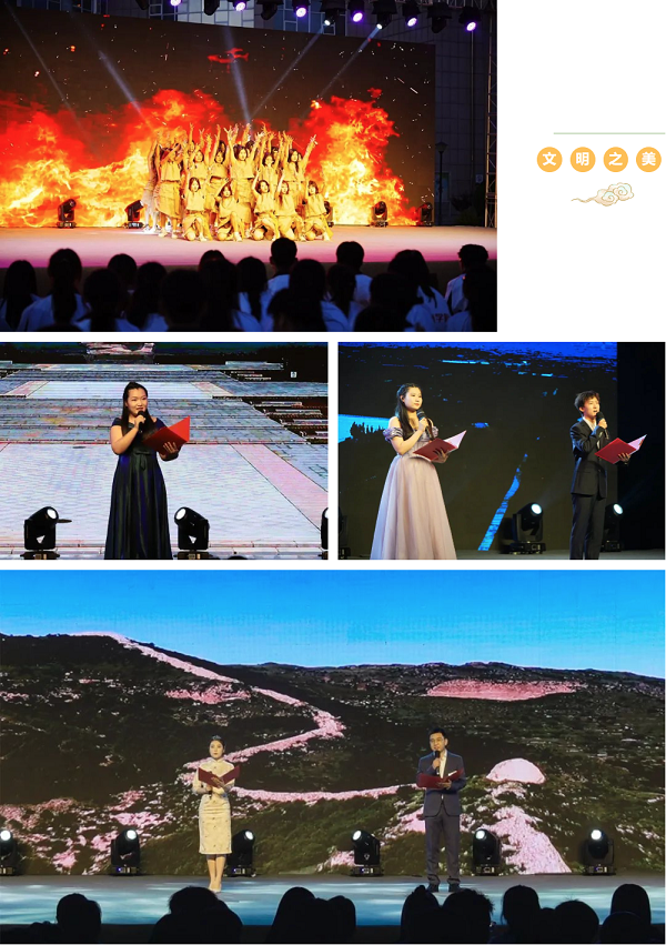 今年的诗会以“美诵张家口·高歌新时代”为主题,共分为“文明之美”“生态之美”“时代之美”“奋斗之美”四个篇章。在展现中华千古文明的集体舞蹈《火图腾》中, “文明之美”篇章拉开序幕。《泥河湾,人类第一个脚步声》《涿鹿,是历史珍藏的一片彩釉》和《大境门》三首诗作,通过朗诵者的深情诵读,传唱着华夏文明的千年雄浑和张垣大地悠久的历史脉络;“生态之美”篇章则通过《春天里的中国(节选)》《坝上的七月》《蔚州诗章》、《清水河》《在康巴诺尔草原》《闪电河畔》《崇礼滑雪场》《张家口,好一片大好河山》等优秀作品,赞颂张家口大好河山的壮美,将一幅秀美的生态画卷在现场观众的心中徐徐展开;“时代之美”篇章中,由best365教师、企业代表和梦飞扬朗诵艺术团学生们演绎的《时间的入口(节选)》《在喜庆的日子里》两首作品,表达出了广大党员干部群众在党的二十大精神指引下以奋斗姿态重整行装再出发的信念和坚定不移跟党走、为党和人民不懈奋斗的初心使命。诗会在“奋斗之美”篇章《春天的模样》《无奋斗不青春》两首作品中接近尾声,伴随着一声声铿锵有力的青春誓言,诗会迎来最后的高潮,专业而流畅的表演让在场观众沉浸其中,诗会在《乘风破浪再出发》的歌声中落下帷幕,同时,也展示出了张职院全体师生乘风破浪再扬帆、改革开放再出发的光明前景。