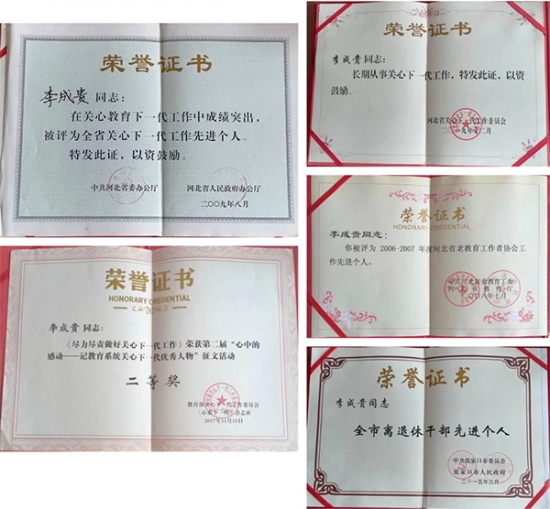 多年来,李成贵发扬“退休不褪色,离岗不离党”的奉献精神,在关注教育事业、关心下一代等工作中积极发挥余热,以实际行动回馈社会、温暖社会、展示自身价值。因成绩突出,李成贵先后受到省委、省政府,市委、市政府,省委教育工委、省教育厅和教育部关工委、河北省关工委的表彰。2023年,经过严格选拔,依托自身丰富的阅历经验、过硬的技术技能,李成贵成功入选我市“银发人才库”,用他的知识智慧继续为经济社会发展建言献策,贡献力量。