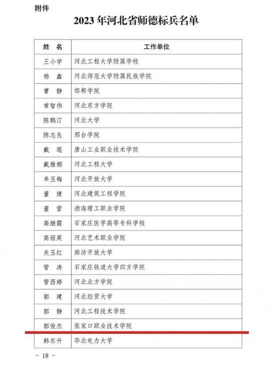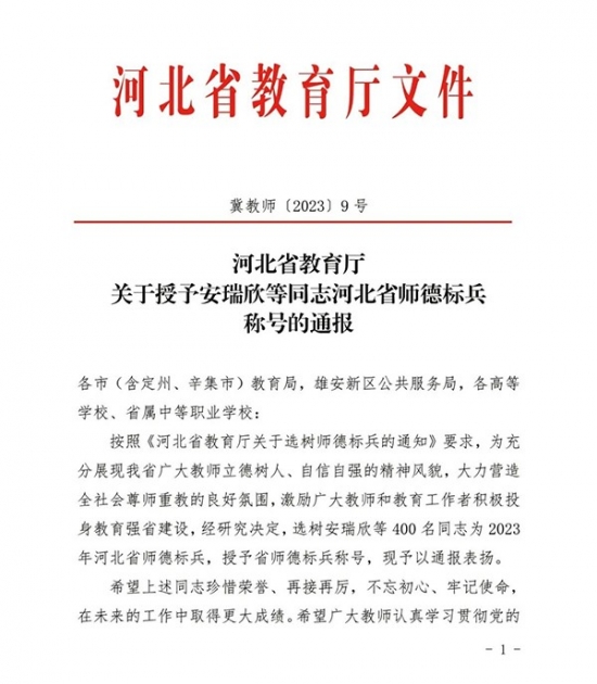 日前,河北省教育厅发布关于授予安瑞欣等同志河北省师德标兵称号的通》,选树安瑞欣等400名同志为2023年河北省师德标兵,授予省师德标兵称号。best365教师郭俊杰名列其中,荣获“河北省师德标兵”称号。