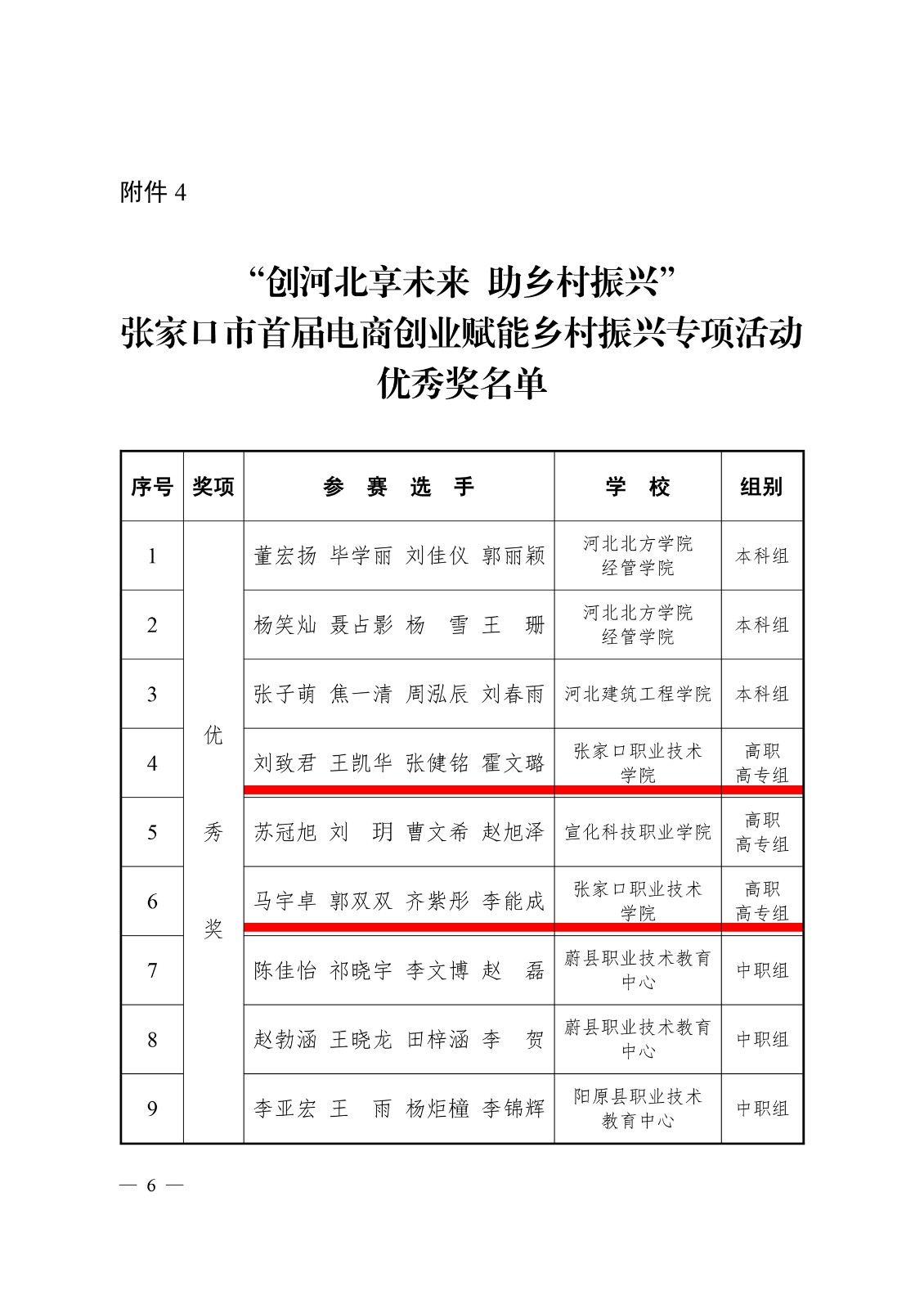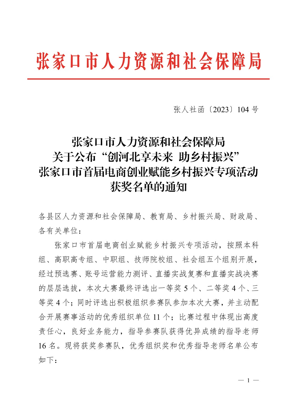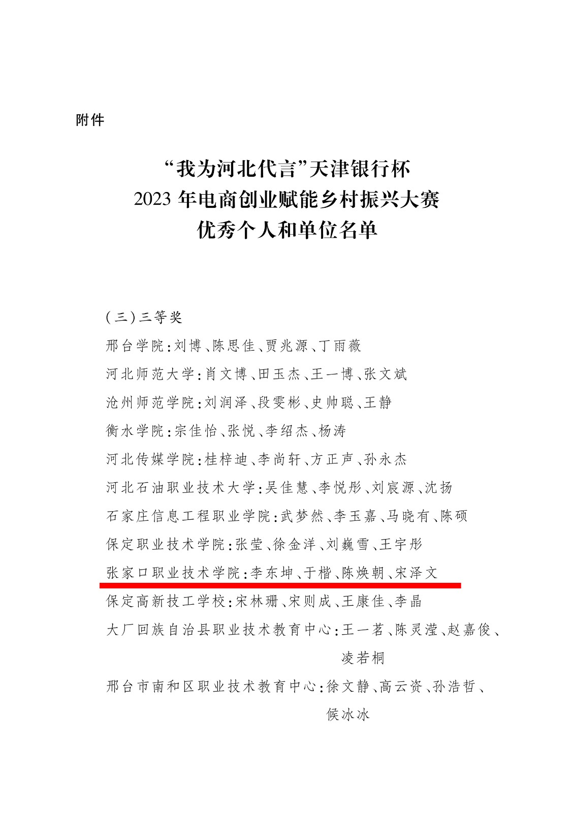 近日,河北省人力资源和社会保障厅、河北省乡村振兴局、张家口市人力资源和社会保障局公布了河北省第二届“我为河北代言” 电商创业赋能乡村振兴大赛获奖名单和“创河北享未来 助乡村振兴” 张家口市首届电商创业赋能乡村振兴专项活动的获奖名单。best365获得省赛三等奖一项,市赛一等奖一项、二等奖一项、优秀奖两项,优秀指导教师四名。