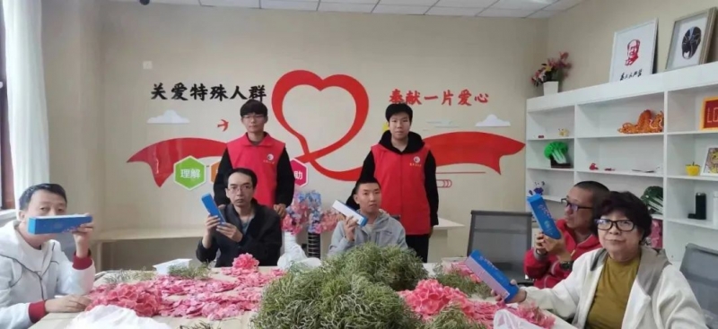 活动中,同学们走进残障人士的生活,与他们进行面对面、心对心的沟通与交流,帮助他们制作了手工花,用实际行动传递爱老助残之心。