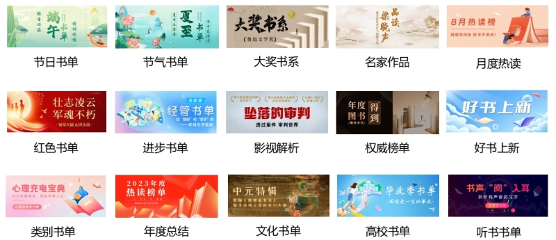 节气书单、好书上新、大奖书系、热读榜、节日书单等特色主题书单,每月定期更新,旨在让书籍焕发光彩,为读者带来新的发现。