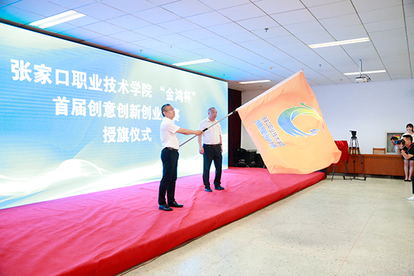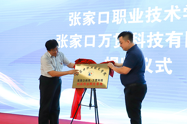 院长王立军为本次大赛授旗,并代表学院与张家口金达开元有限公司、张家口万贯科技有限公司进行合作签约; 党委书记冯印涛与万贯科技董事长杨嘉共同为创新创业孵化基地揭牌。